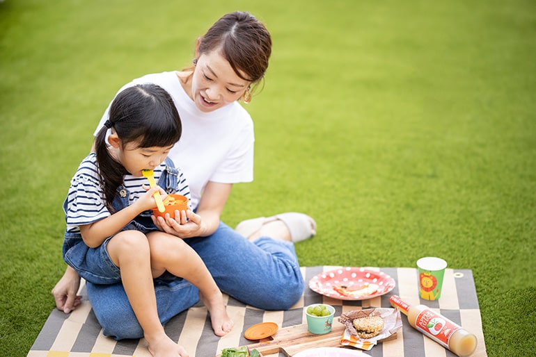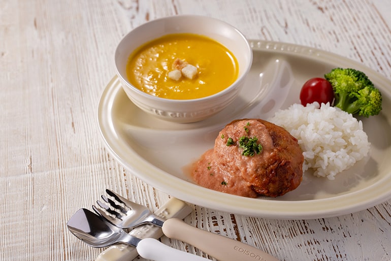 お子さんの発育を考え、シェフと管理栄養士がタッグを組んで開発した幼児食メニューには、例えば「白砂糖ではなくきび糖を使う」や、「ハンバーグにはたんぱく質を多く含むおからパウダーを入れる」、「優しい甘味を出すためにレーズンを加える」など、さまざまな愛情と工夫が込められています。